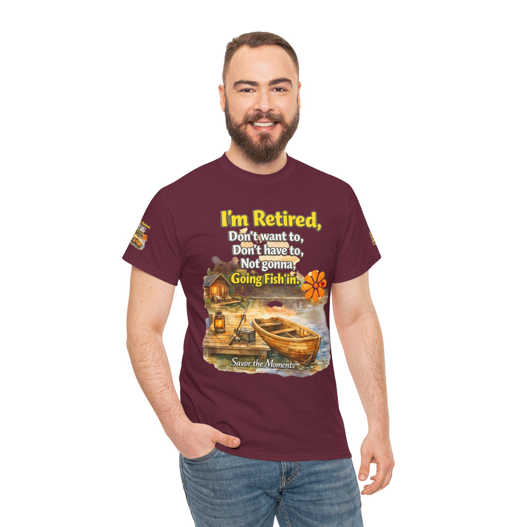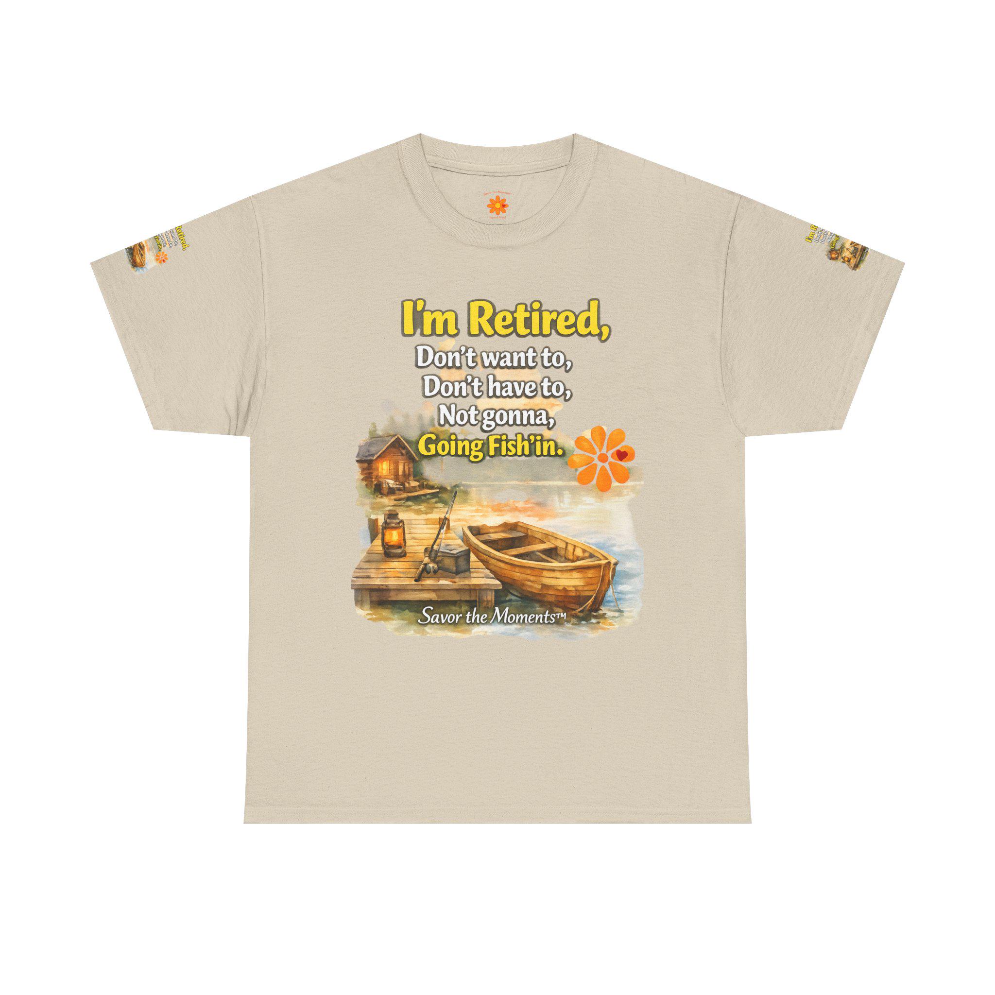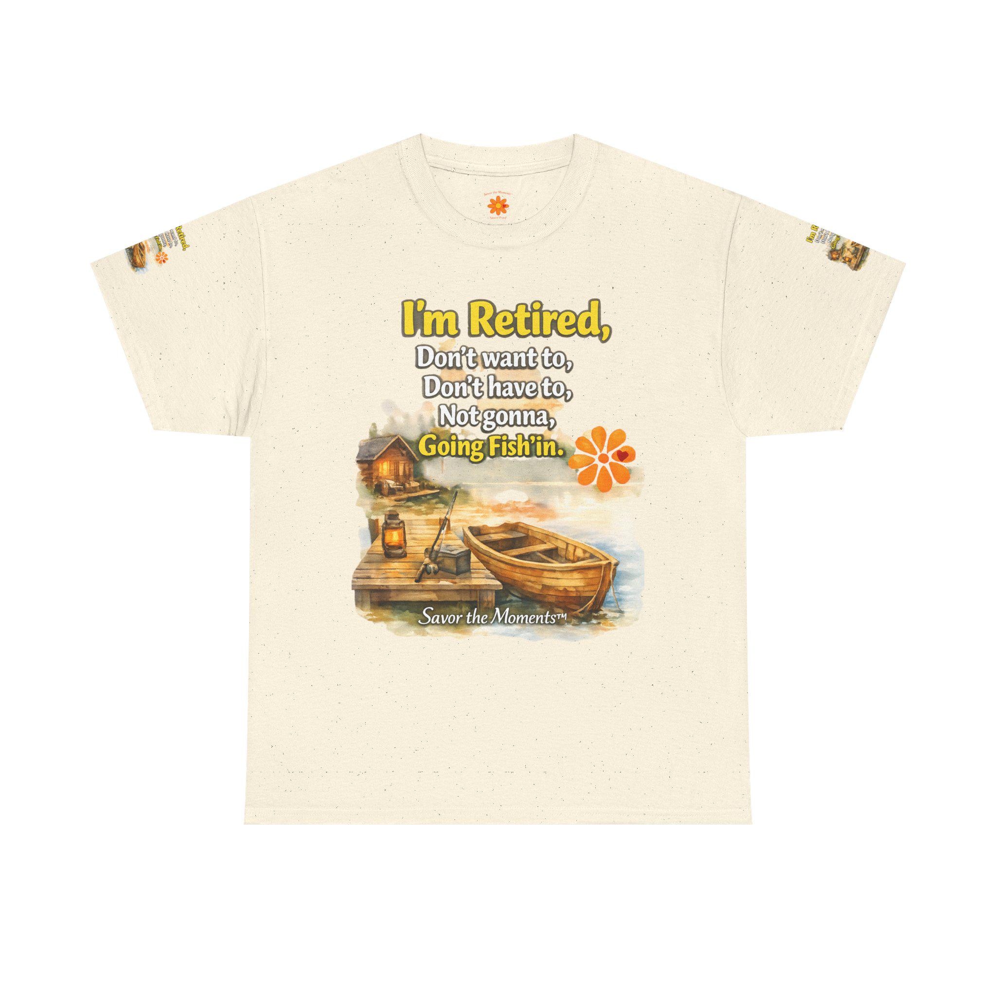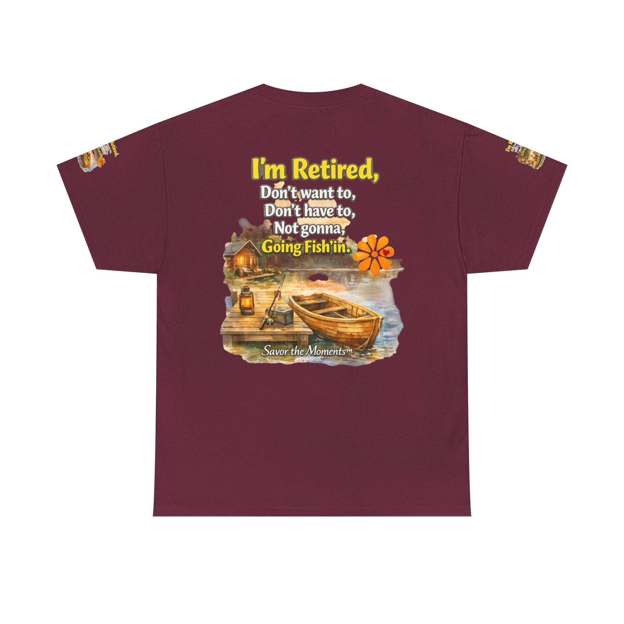 A soft, breathable cotton tee that feels like easy mornings by the lake. The shirt shows a warm watercolor scene: a wooden boat tied to a weathered dock, a small cabin with a lantern glowing, and gentle ripples in the water. Over the image sits a playful, retired-person mantra that reads like a wink to anyone who’s swapped schedules for slow days. The overall vibe is relaxed and nostalgic — the kind of shirt you reach for when you want to be comfortable and quietly content. It layers well under a flannel for cool dawns or wears alone while sipping coffee on the porch. The sleeve details and printed inner label add a thoughtful, finished touch that fans of cottage and lakeside life will notice and appreciate.