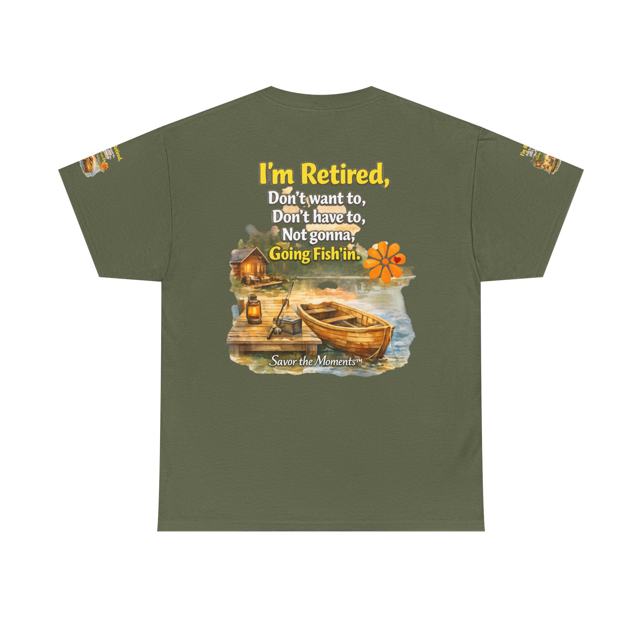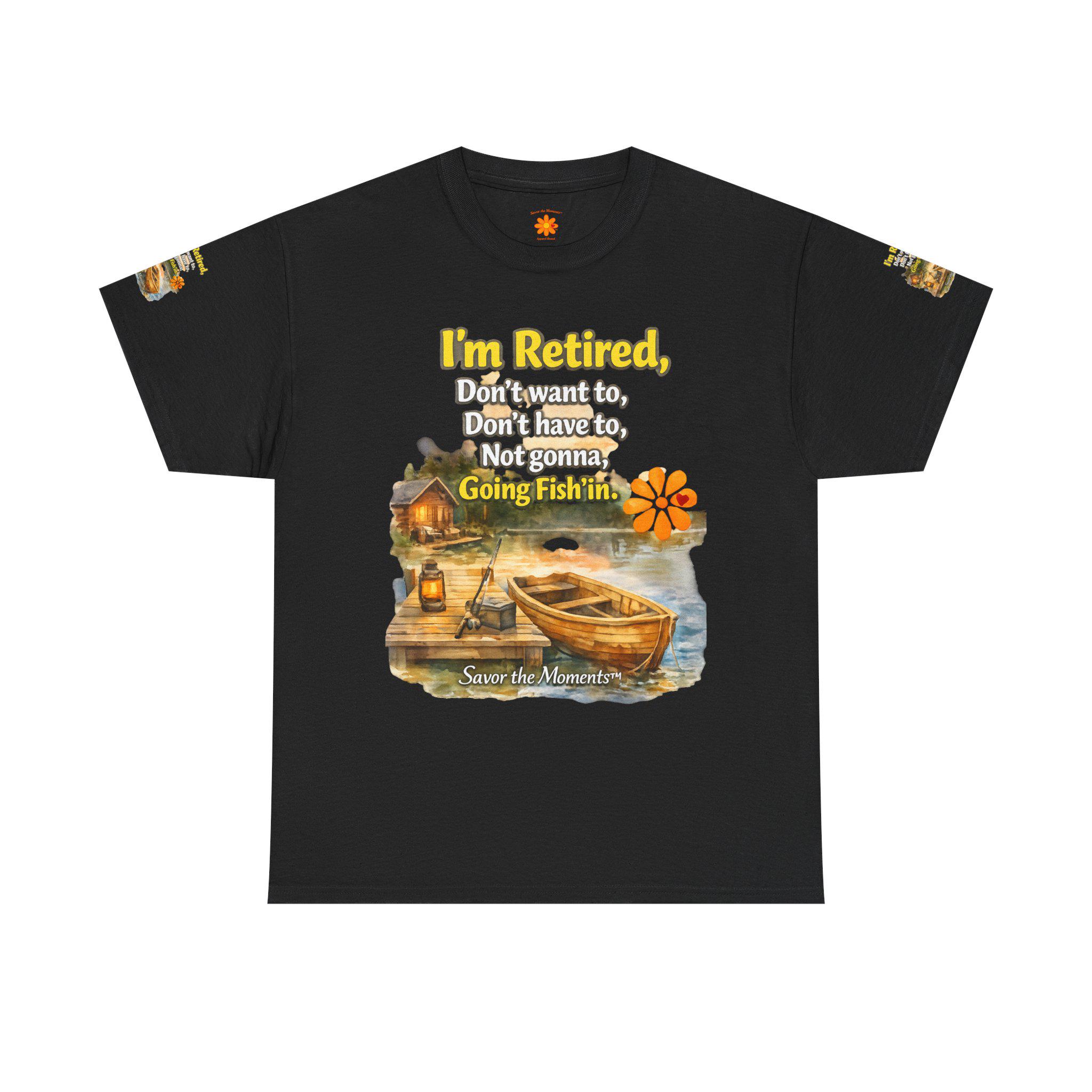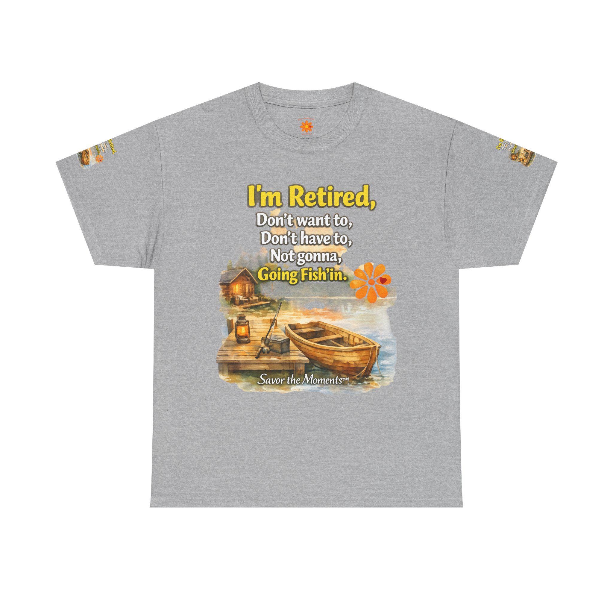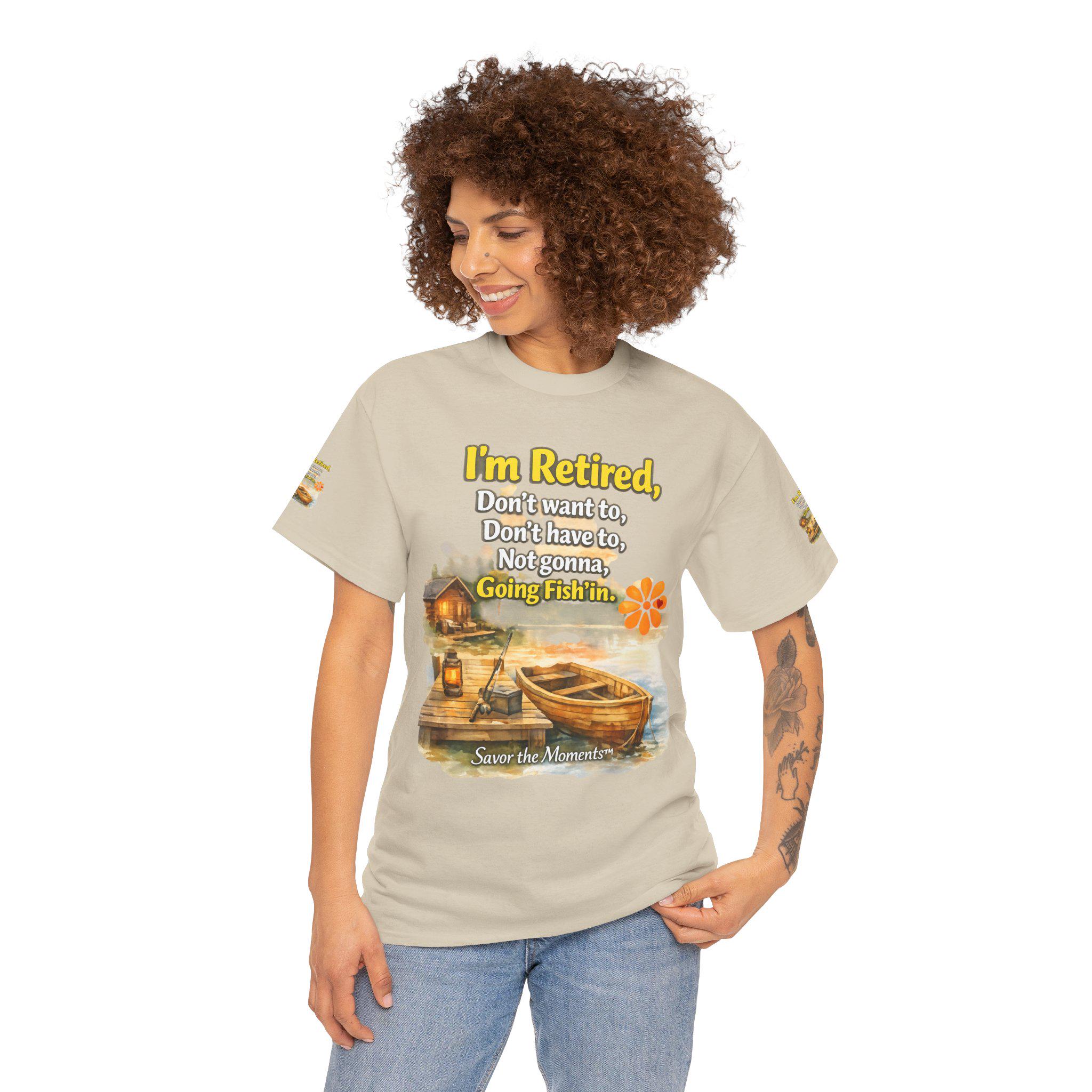 A soft, breathable cotton tee that feels like easy mornings by the lake. The shirt shows a warm watercolor scene: a wooden boat tied to a weathered dock, a small cabin with a lantern glowing, and gentle ripples in the water. Over the image sits a playful, retired-person mantra that reads like a wink to anyone who’s swapped schedules for slow days. The overall vibe is relaxed and nostalgic — the kind of shirt you reach for when you want to be comfortable and quietly content. It layers well under a flannel for cool dawns or wears alone while sipping coffee on the porch. The sleeve details and printed inner label add a thoughtful, finished touch that fans of cottage and lakeside life will notice and appreciate.
